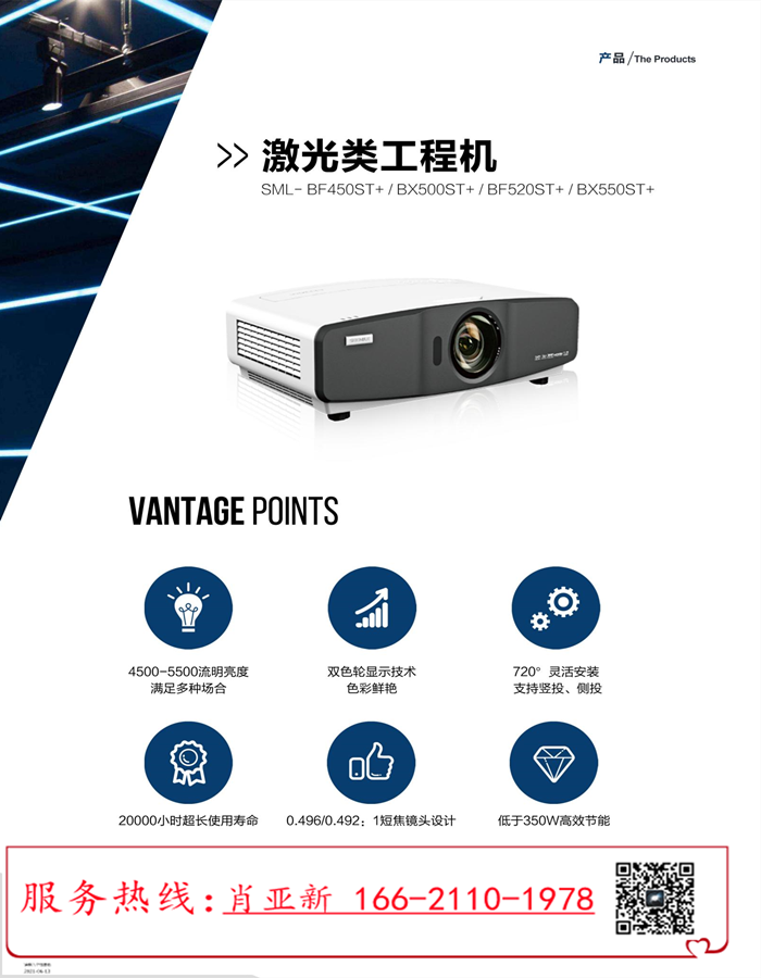| [簡介]SML-BF550ST+/BX550ST+/BF550+一、技術(shù)參數(shù):1.芯片尺寸(0.65英寸)對角線(16:9寬高比)2.顯示方式DLP™芯片x1,DLP™3.物理分辨率1080P,1920x10804.亮度55005.動態(tài) |