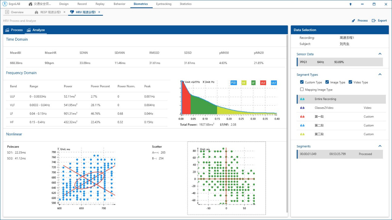 產品詳細介紹心電與脈搏信號分析 自動化多角度分析模式 :基于自動識別/自定義整段、場景、事件及片段分析,滿足對時間點或時間段內數據趨勢變化的精確分析。支持狀態識別研究的自動化處理,如疲勞狀態、認知負荷,輸入研究時間段參數,自動化完成特征值提取與分析。 數據處理與特征點提取 :系統內置多種信號處理方式,包括小波、高/低通濾波等對原始信號進行處理,自動標記R峰值點(包括異常值檢測、異常點矯正),提取IBI間期,進行數據統計與分析,可一鍵導出.csv文件。 數據統計與可視化報告: 支持IBI間期的時域統計、經FFT轉換的頻域數據以及非線性分析,從不同角度挖掘數據信息。支持一鍵導出原始數據、處理數據、統計分析數據以及結果的可視化報告,更加可靠與豐富。 多模態數據同步交叉統計 :支持HRV信號與多模態數據進行交叉統計分析,包括行為、眼動、腦電、動作捕捉以及其他的生理電信號數據,實現多維度的結果驗證與多模態數據更精確的的狀態識別。 HRV高級數據處理分析模塊可以結合人機環境同步平臺和生理記錄系統采集到與HRV指標相關的生理信號進行離線處理和分析。可對信號進行自由選擇、放大、縮小,便于瀏覽數據;在整體呈現數據的基礎上,還可以根據片段、事件、場景三種分割方式進行數據呈現與分析;可導出ASCII格式的原始數據、處理后數據和分析后數據;并可導出可視化分析報告。