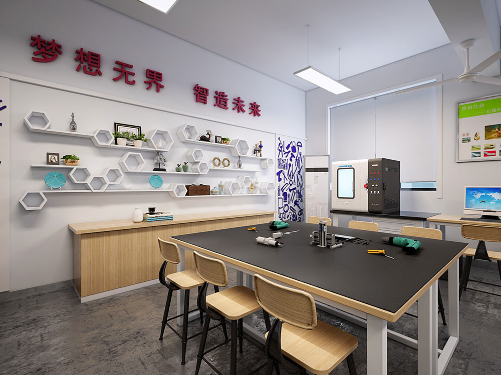 創客實驗室由電磁學設計與搭建區、聲學設計與搭建區、機械設計與搭建區、光學設計與搭建區、新能源設計與搭建區、3D打印、無人機和智慧墻創意區等組成。