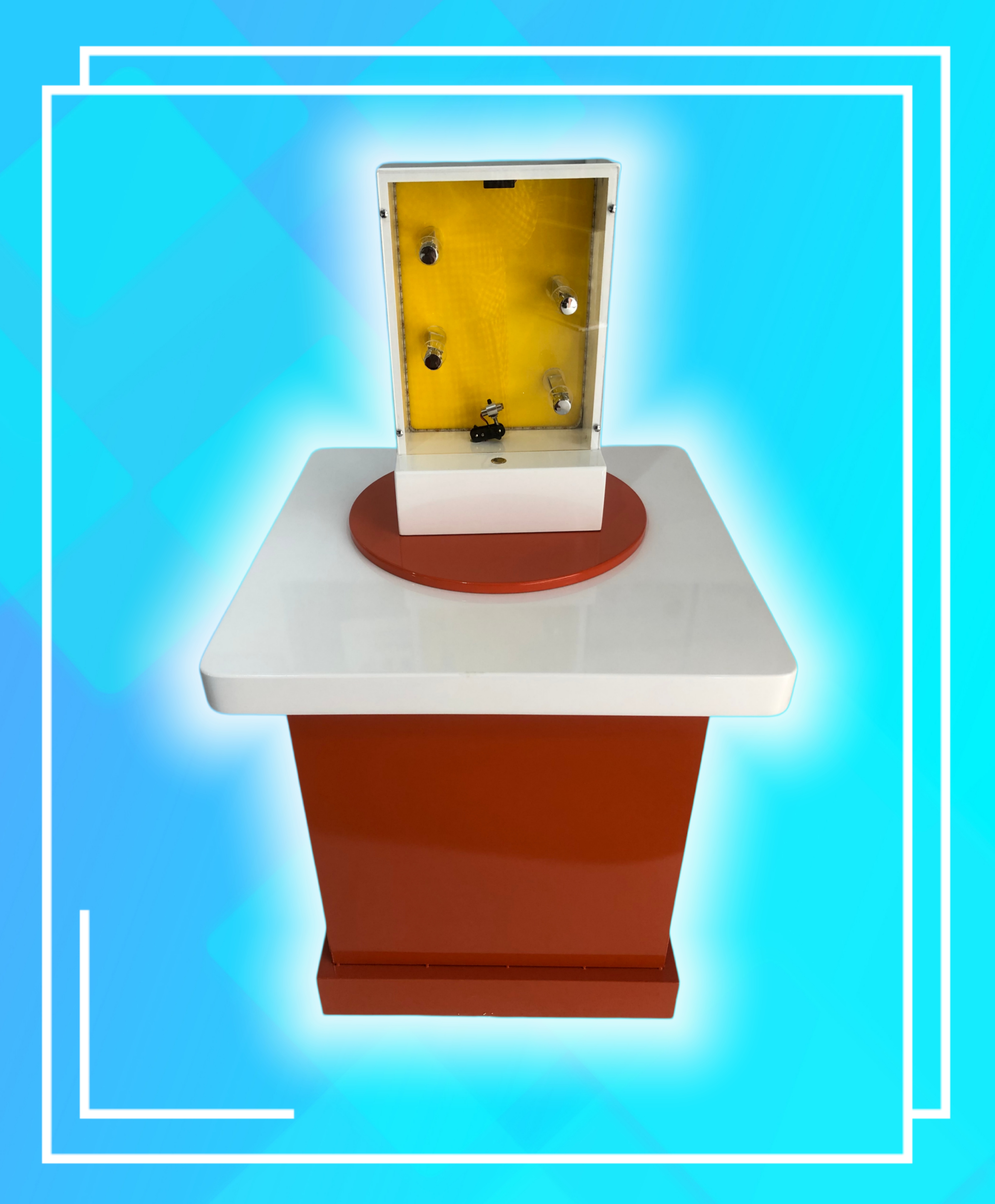 三、功能概述:展品由箱體、半透半反鏡、反射鏡、LED燈組、發(fā)光模型、擺動機構和操作手輪組成。前端是一面半透半反鏡,后端是反射鏡,燈光發(fā)出的光線被反射鏡反射回來,一部分透過半透半反鏡而被看到,另一部分被半透半反鏡再次反射到后端反射鏡,多次反射后形成諸多物體的像,無限重復的影像,一個比一個更遠,就像一條無盡的隧道。當擺動后端反射鏡時,光的反射路徑發(fā)生了變化,就會看到彎曲的光隧道。