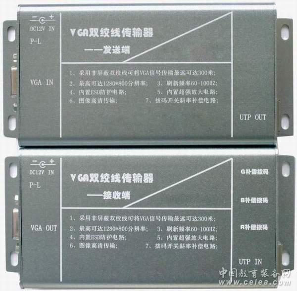 產品詳細介紹VGA雙絞線傳輸器(Kylines VGA300),VGA延長器,VGA收發器,VGA長線驅動器,VGA放大器 一、產品概述: 為了解決VGA信號+音頻信號較長距離的傳輸時,發生的圖像重影,顏色失真等問題,北京麒麟視訊科技有限公司研發生產了這款雙絞線VGA傳輸器,可以傳輸距離為0--300米,是專為網絡平板顯示及大屏幕幕墻顯示廣告工程、工業自動化控制、醫療設備、安防監控、多媒體教學等顯示系統工程中高質量VGA視頻信號長距離傳輸的需求而專業設計的集VGA信號轉換、分配、驅動、接收和還原功能為一身的信號傳輸系統。它可以將VGA信號通過非屏蔽五類網線上平衡傳輸,以增強對共模噪聲及干擾信號的抑制,同時大幅度地節約線材成本并簡化了工程布線。采用專利技術將H和V信號編碼至RGB信號上加重處理后發送,僅利用CAT-5電纜的三對雙絞線完成VGA、SVGA、SXGA、XGA、SXGA的RGBHV信號的平衡編解碼,并采用遠距離高頻補償加重處理,帶寬高達350MHz。使XGA(最高1600*900/60Hz)的傳輸距離達到300米,以滿足大型工程投影機、顯示器、TFT-LCD TV、PDP信號傳輸的需要。由于整個傳輸系統采用了加權零值拆分的平衡傳輸的專利技術,因此雙絞線在傳輸信號時不會對外造成EMI的干擾。可通過設置撥碼開關來調整傳輸距離的遠近。