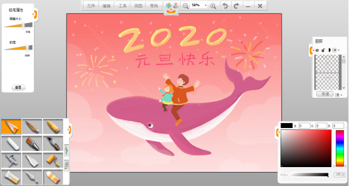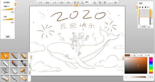 第四步:現在就開始在新建的透明圖層上繪制草圖。用左下角畫筆面板中的“鉛筆”工具,在筆觸上方畫筆屬性面板調節好筆刷的大小和軟硬度,開始繪制草圖。注意構圖,圖像的疏密關系以及圖文的組合。大大的“2020”可以使用蠟筆筆觸重點突出啦。