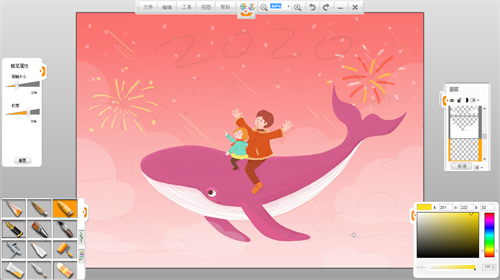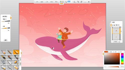 第五步:整體上色。新建圖層,確定整幅畫面的色調,這一步可以暫時忽略細節,把注意力放在確定大的色塊上,考慮主體色調和整體的顏色效果。背景使用樂畫軟件主菜單欄的工具中的“漸變工具”進行填色,云彩用“橢圓工具”選中區域后用“油漆桶工具”填色并調節所在圖層的透明度,鯨魚用蠟筆筆觸填色,邊緣適當使用“橡皮擦工具”修整。