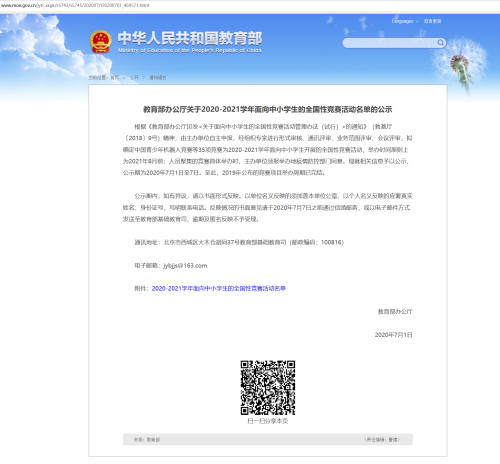 根據《教育部辦公廳印發<關于面向中小學生的全國性競賽活動管理辦法(試行)>的通知》(教基廳〔2018〕9號)精神,由主辦單位自主申報,經組織專家進行形式審核、通訊評審、業務范圍評審、會議評審,擬確定中國青少年機器人競賽等35項競賽為2020-2021學年面向中小學生開展的全國性競賽活動,舉辦時間原則上為2021年8月前;人員聚集的競賽具體舉辦時,主辦單位須報舉辦地疫情防控部門同意。現就相關信息予以公示,公示期為2020年7月1日至7日。至此,2019年公布的競賽項目舉辦周期已完結。