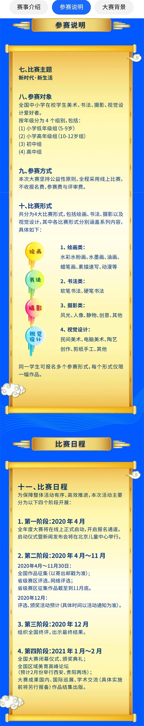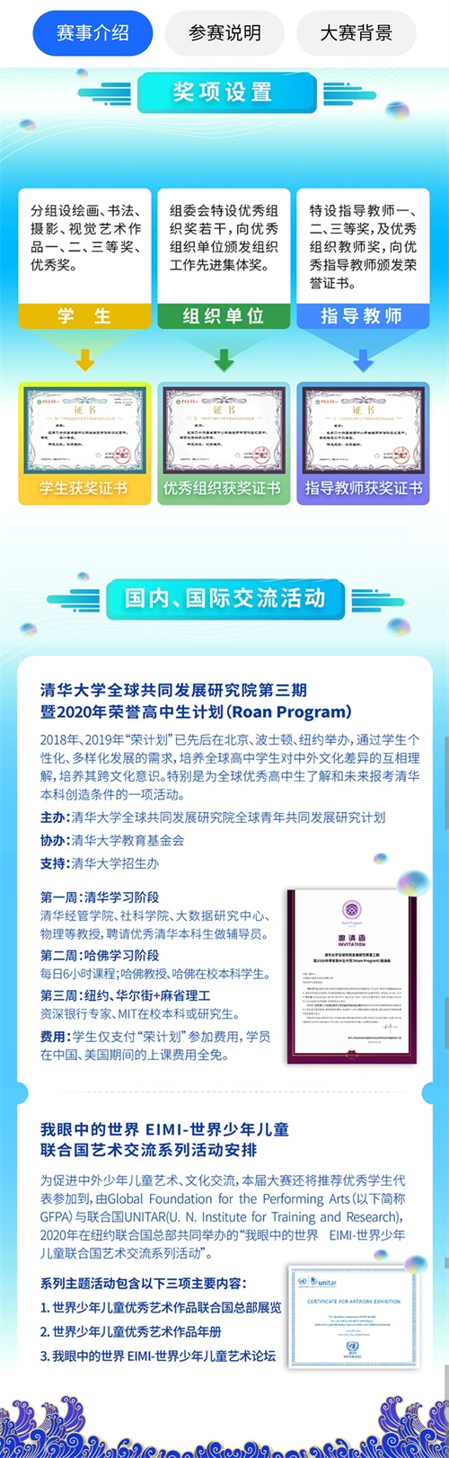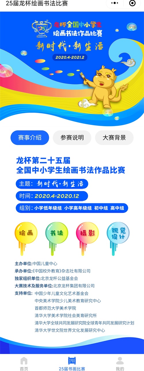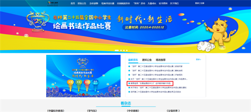 由教育部辦公廳發文公布,由中國兒童中心主辦,中國美術家協會協辦的全國中小學生繪畫書法作品比賽創辦于1995年,是經教育部批準的面向小學到高中各年齡段青少年兒童的,有著廣泛影響力的青少年素質教育活動。比賽至今已經舉辦二十四屆,全國參賽學生累計達到一千多萬人次,遍及全國三十余個省、市、自治區、直轄市,2019年覆蓋到了港澳臺及海外華人地區,是一項有著廣泛影響力的重要藝術比賽活動,也是教育部唯一保留下來具有引領性的大型藝術類教育比賽活動。這一比賽活動最大的特色是面向全國(包括港、澳、臺)以及海外華人、華僑青少年兒童征集書畫作品。在80個城市設有大賽集體組織單位,大賽分為少年組(12-17周歲)、兒童組(7-11周歲)、幼兒組(7周歲以下),每屆參賽者近五十萬,每屆大賽持續時間貫穿全年。組委會也將邀請著名藝術教育專家及優秀美術教育者對作品進行評審后頒發獲獎證書。該比賽活動對于普及少年兒童美術教育,促進少年兒童全面發展起到了良好的作用。