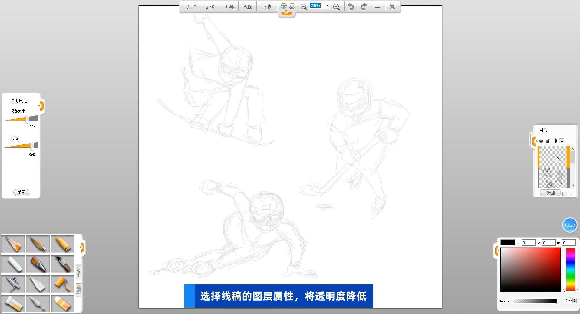08 將草稿層的圖層透明度降低,作為后面繪畫的參考