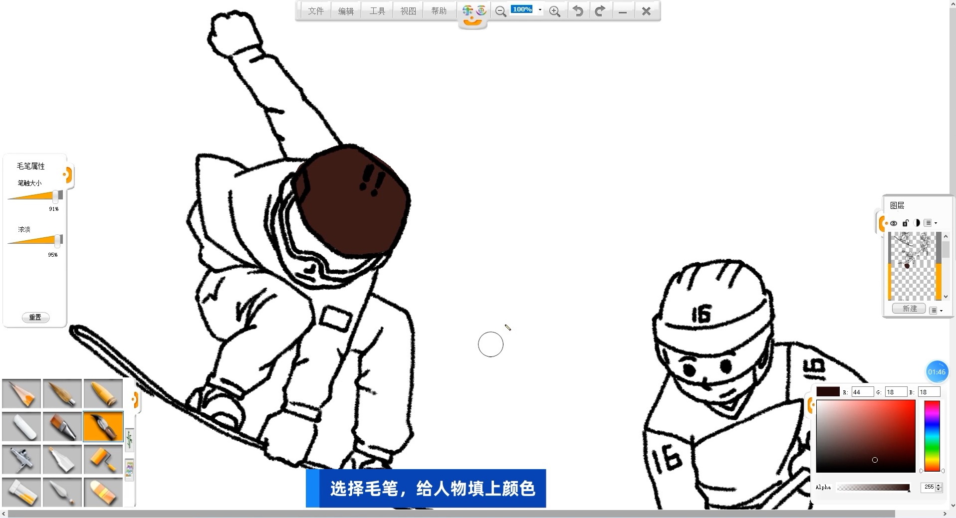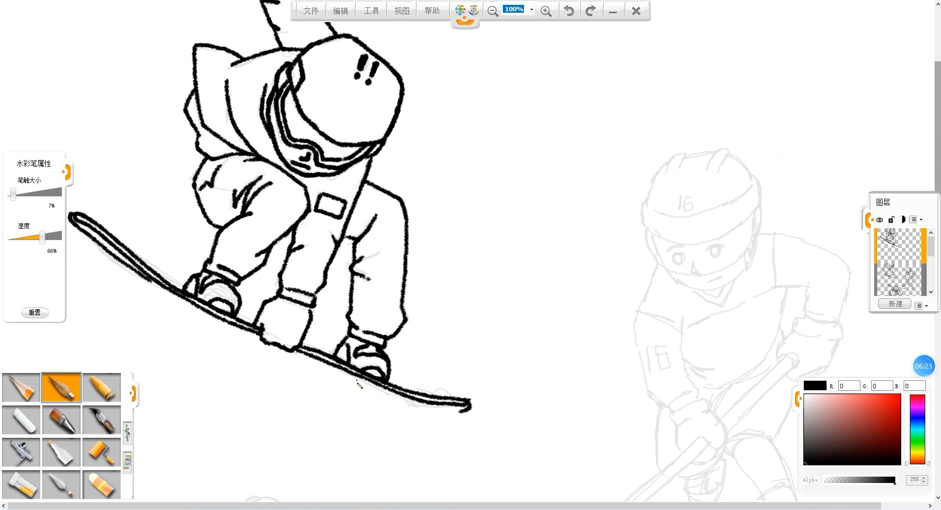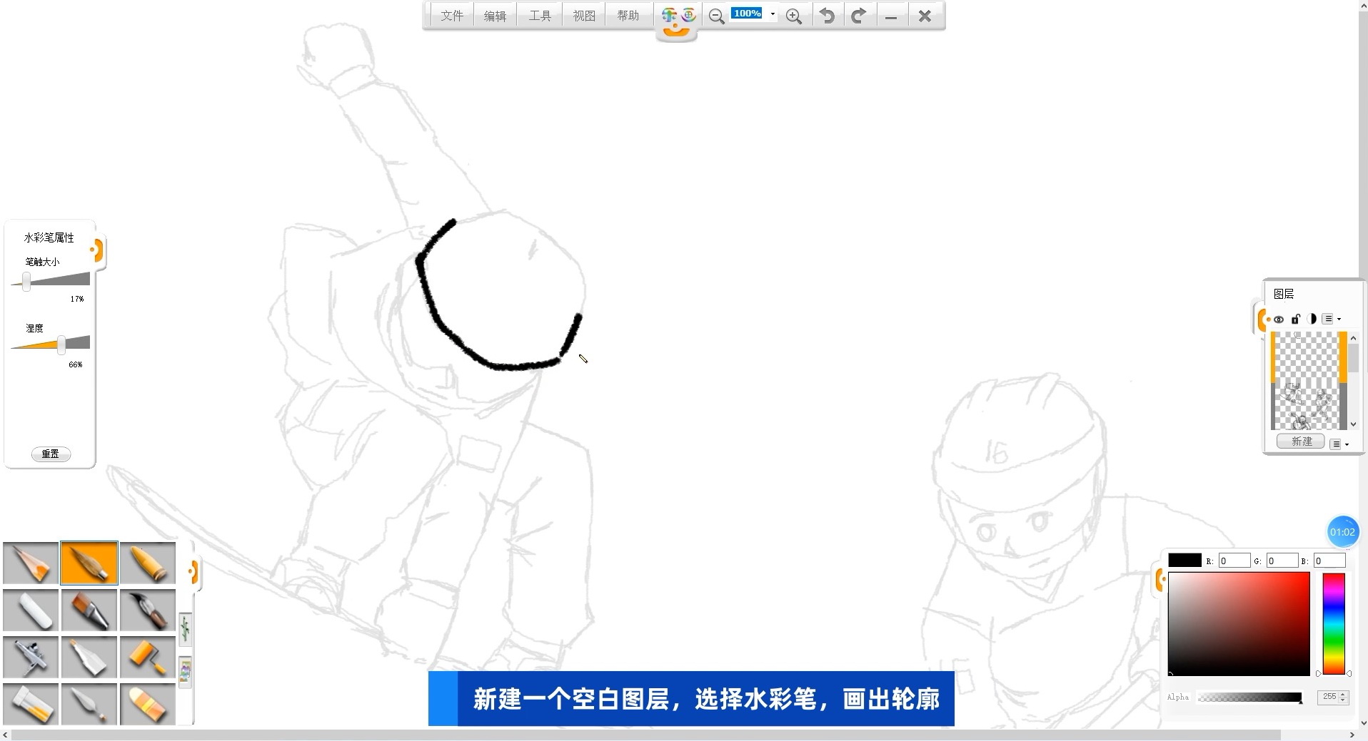 09 選擇水彩筆筆觸,黑色,按照草稿參考,畫出人物的輪廓