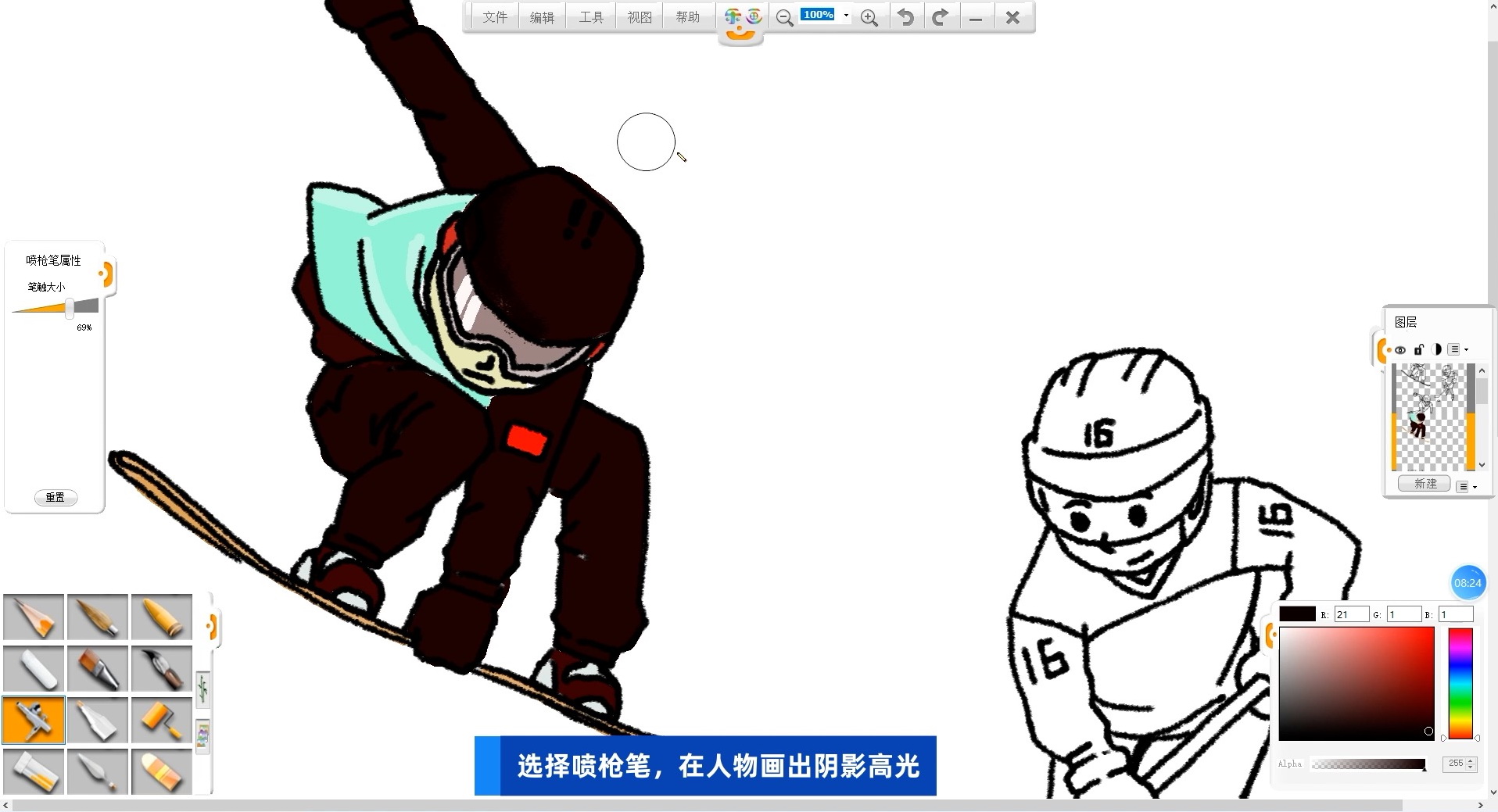 13 選擇噴槍筆筆觸,在畫好的顏色上,再畫出人物的陰影高光部分