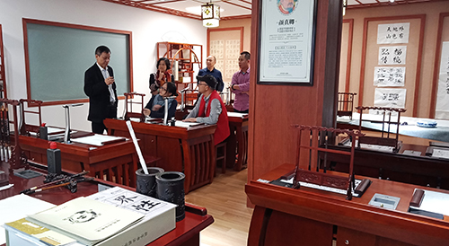 在董事長陳登貴先生的陪同下,東莞市書法家協會一行領導參觀了智慧書法教室展廳,詳細了解了公司智慧書法教室的軟、硬件研發情況,并對廣視通智慧書法教室所取得的成績給予了高度評價,同時也提出了一些建設性、針對性和可操作性建議。