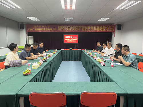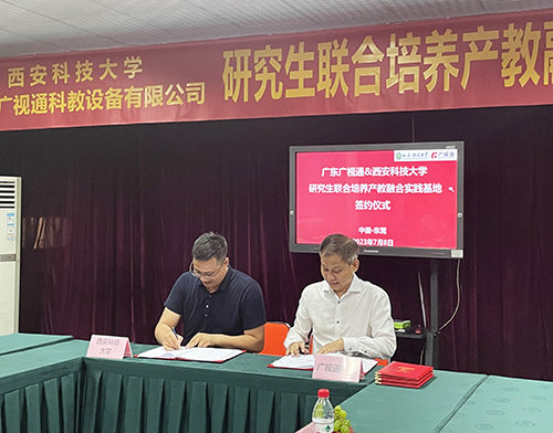 2023年7月8日下午,廣東廣視通科教設備有限公司與西安科技大學“研究生聯合培養產教融合實踐基地”簽約儀式在廣視通大廈二樓會議室舉行。西安科技大學管理學院副院長鄒紹輝,西安科技大學大灣區研究生聯合培養產教融合實踐基地導師羅立升,西安科技大學大灣區MBA校友會籌備組秘書長、東莞市市場監督管理局石排分局同仲強,大灣區西安科技大學MBA校友會籌備組委員陳桂;特邀嘉賓廣東科技學院黨委副書記、副校長畢會東,東莞市名校研究生培育發展中心林洪嘉;公司董事長陳登貴、副總經理吳斌華、副總經理潘富兵等出席簽約儀式。由西安科技大學大灣區研究生聯合培養產教融合實踐基地導師羅立升主持簽約活動。