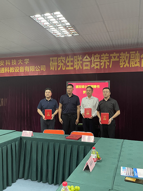 座談會結束后,西安科技大學管理學院副院長鄒紹輝、廣東廣視通科教設備有限公司董事長陳登貴分別代表雙方簽訂共建“研究生聯合培養產教融合實踐基地”合作協議并進行授牌,鄒紹輝副院長為陳登貴董事長及實踐基地建設團隊導師頒發校外碩士導師聘書。