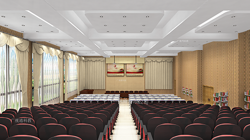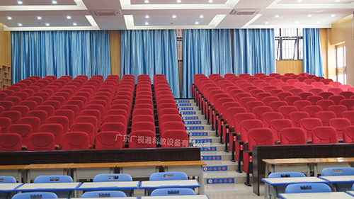 多功能會議室(階梯室),此種教室面積大,容納人數多,但其特點在于其地板是階梯狀逐漸升高的,離講臺越遠,地面越高,從而座椅就越高,這樣就使得遠離講臺、座位靠后的學生能夠清楚地看見黑板和講臺,而不會被前排學生擋住視線。