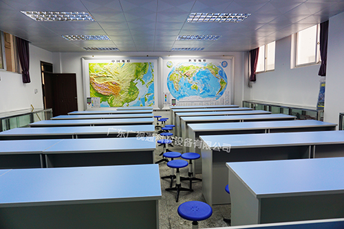 地理專用場室主要配有星象儀、典型的地形地貌、聲光電中國立體地形和世界立體地形、日月地運行儀、多功能演示柜、多媒體演示系統等設備。