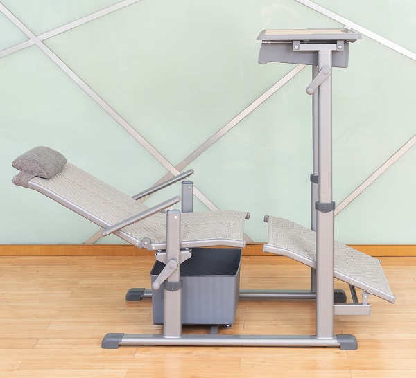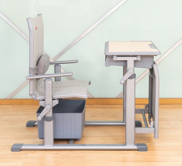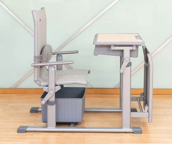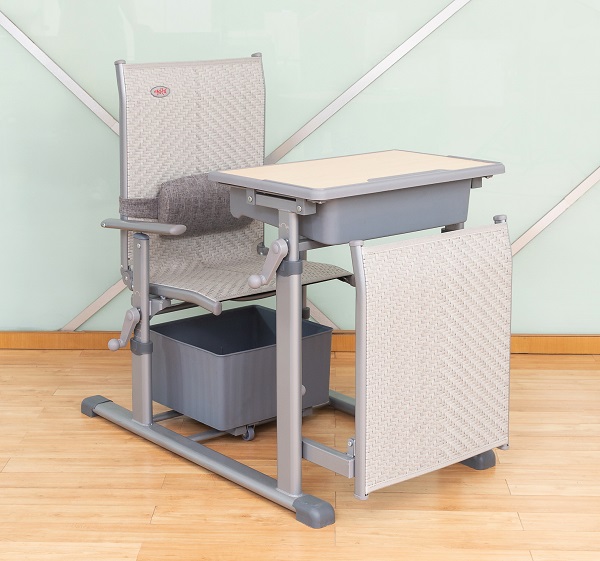 4、課椅規(guī)格及材料:460mm*380mm*(座椅面高420mm-460mm可手搖升降調(diào)節(jié))±5mm,椅背可調(diào)最大傾斜度150°。座靠面料采用符合出口標(biāo)準(zhǔn),沖擊100KG,靜壓180KG,60分鐘無(wú)損,抗紫外線不褪色,使用壽命8年以上的環(huán)保PE藤條。藤條規(guī)格為寬7.5mm±0.05mm*厚1.2mm±0.02mm,滕面邊沿采用PE材料包邊,尼龍線縫紉固定工藝。椅下設(shè)置370*330*190mm±3mm的PP材料的貯物箱,貯物箱底下前部設(shè)置雙滑輪,后部設(shè)置滑塊,與課椅下雙滑軌(ABS材質(zhì),規(guī)格315*30*20mm)的卡位裝置結(jié)構(gòu)配合,貯物箱可前后自由限位滑動(dòng),可脫卸。