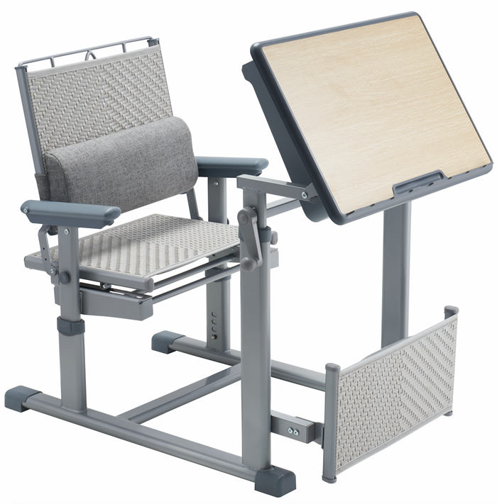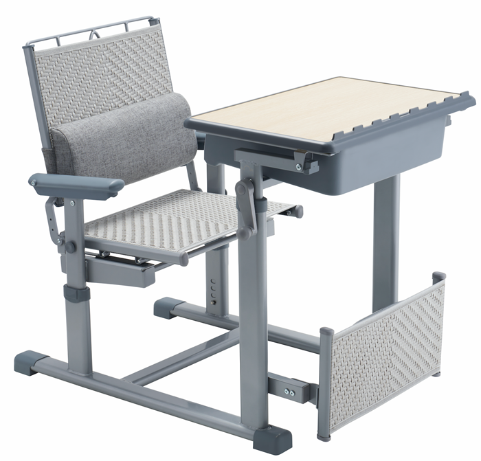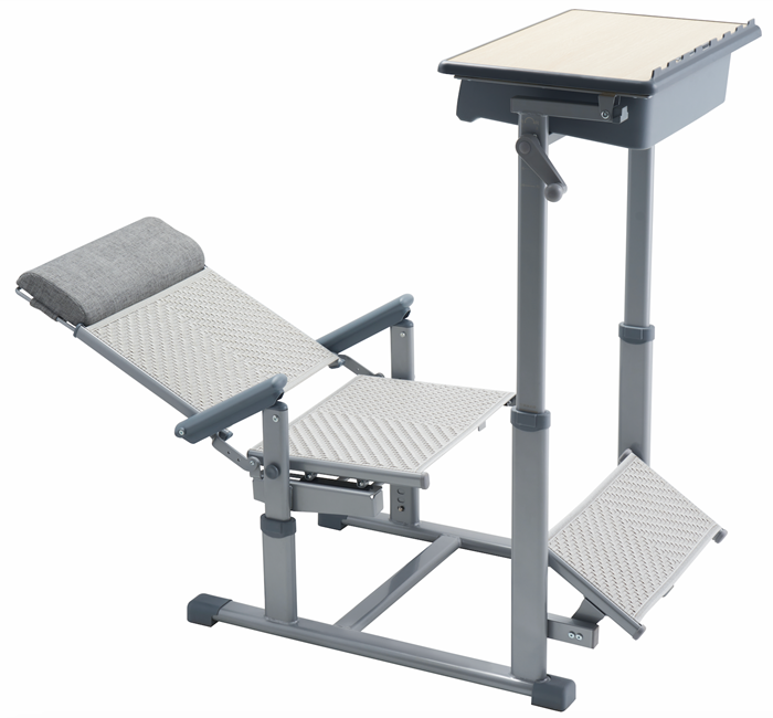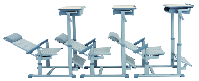 7、課桌椅午休模式:課桌通過單側手搖桿升高到午休高度,課椅靠背后仰,并打開PE藤質擱腳板,借助桌下和椅下空間,可在0.88米前后間距實現(xiàn)150度原位舒適躺休。
