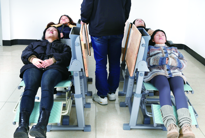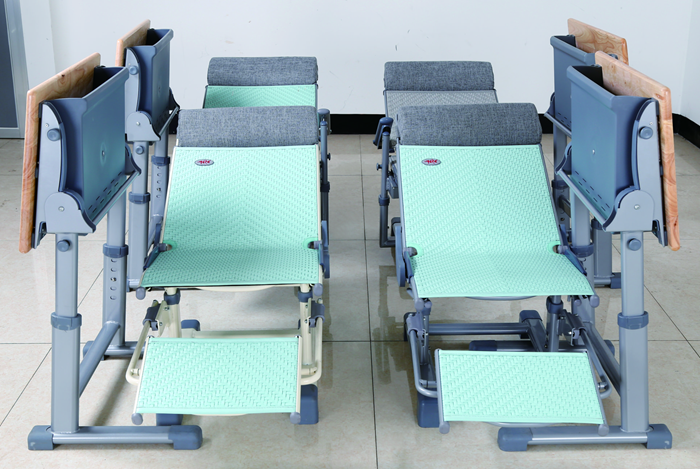 6、課桌椅午休模式:將課桌面板和桌斗通過按鍵變形成垂直模式,將課桌移到課椅側面,并將一側桌腳插入椅腳條和地面的空隙里,插入后整套課桌椅的左右占地尺寸在700mm以內,更好地騰出教室通道空間。課椅底部保持原位,課椅靠背后仰至150度躺椅模式,課椅座面下方水平移出U型腳托支架,支架上設置PE塑料材質的擱腿板,翻轉即可進行使用,可在0.88米前后間距實現150度原位舒適躺休。