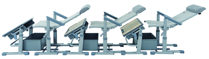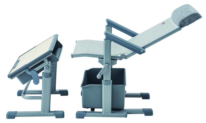 6、課桌椅午休模式:課桌通過兩側(cè)按鍵調(diào)節(jié)到最低高度,并將桌面向前下方折疊固定,課椅靠背向后調(diào)節(jié),借助桌上和椅下空間,可在1米前后間距實(shí)現(xiàn)150度原位舒適躺休。