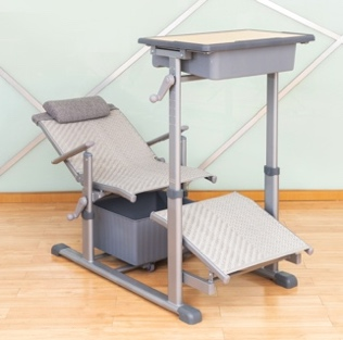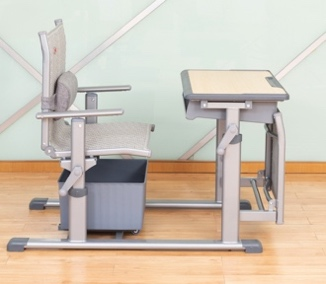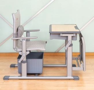 5、課桌椅午休模式下,底部保持原位,課桌桌面可通過單側(cè)手搖桿調(diào)整到最高高度,課椅靠背后仰調(diào)節(jié)至150度,并落下躺板,即可實(shí)現(xiàn)躺休。每套課桌椅產(chǎn)品的前后占地間距980mm,即可達(dá)到學(xué)生個(gè)體躺睡舒適狀態(tài)。