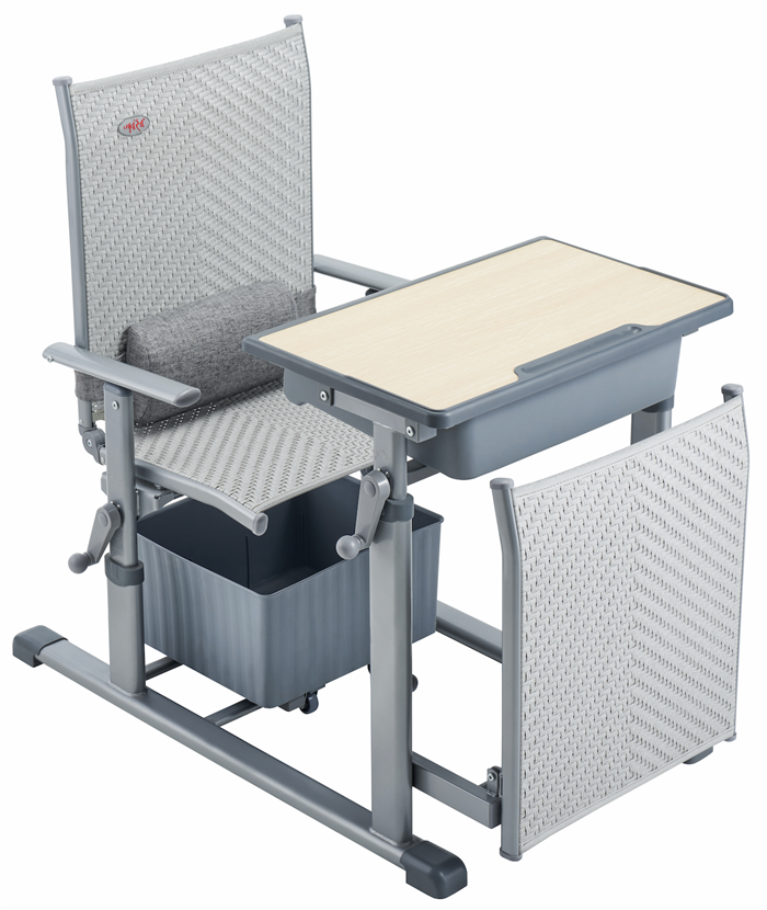 4、課椅規格及材料:寬460mm*深380mm*(座椅面高420mm-460mm可手搖升降調節)±5mm,椅背可調最大傾斜度150°。座靠面料采用環保PE藤質材料。課椅座面前部背面設置寬70mm的丙綸絲編織加強帶,增強課椅座面的承受力。椅下設置370*330*190mm±3mm的PP材料的貯物箱,貯物箱底下前部設置雙滑輪,后部設置滑塊,與課椅下雙滑軌(ABS材質,規格315*30*20mm)的卡位裝置結構配合,貯物箱可前后自由限位滑動,可脫卸。