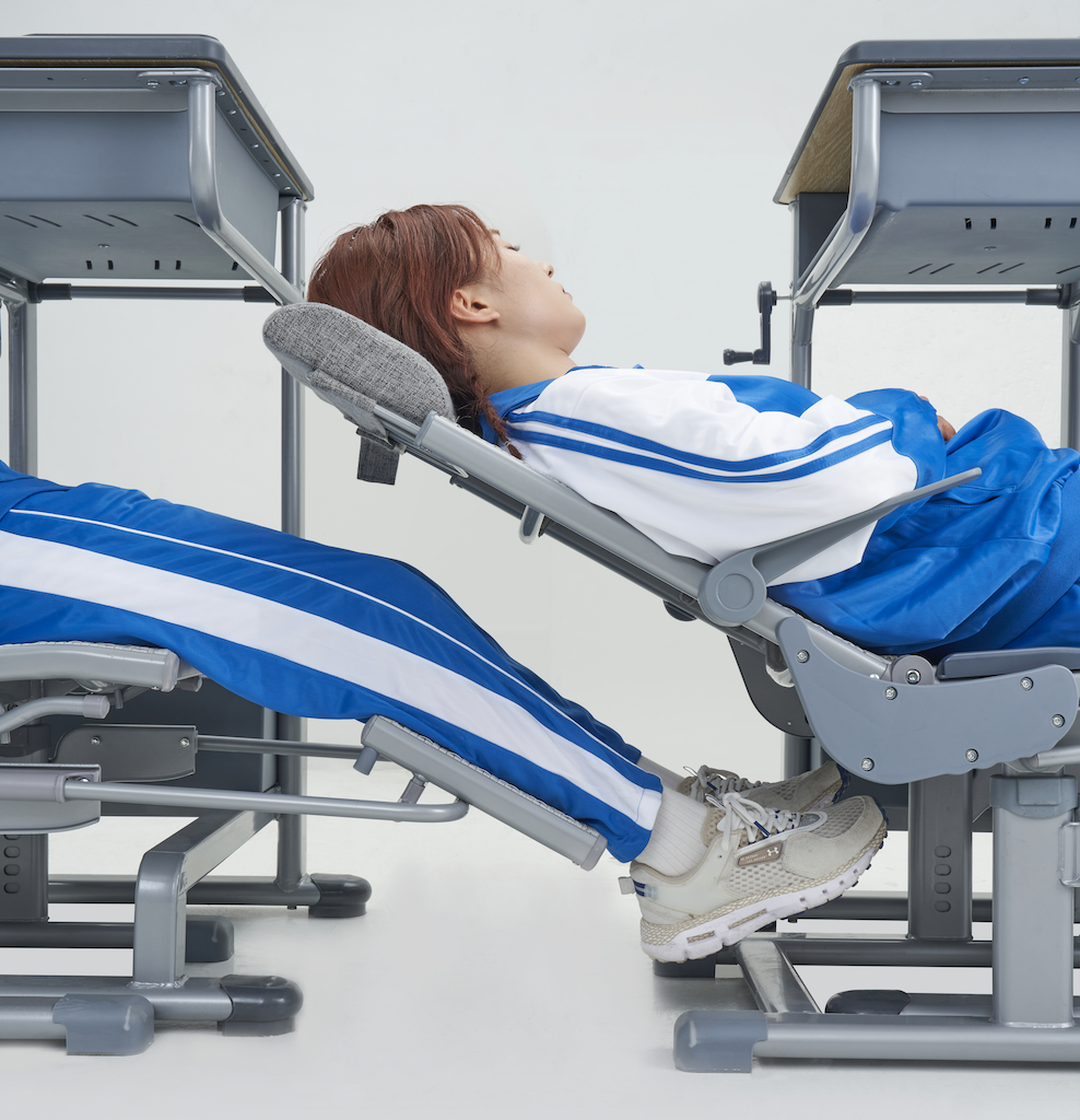產品在教室內擺放時,小學生可在90公分前后間距實現150度原位舒適躺休,中學生可以在1米前后間距實現150度原位舒適午休。而且從座椅轉換成躺椅形態時,也不需要向外擴展空間,滿足多人教室和小面積教室的現實改造。