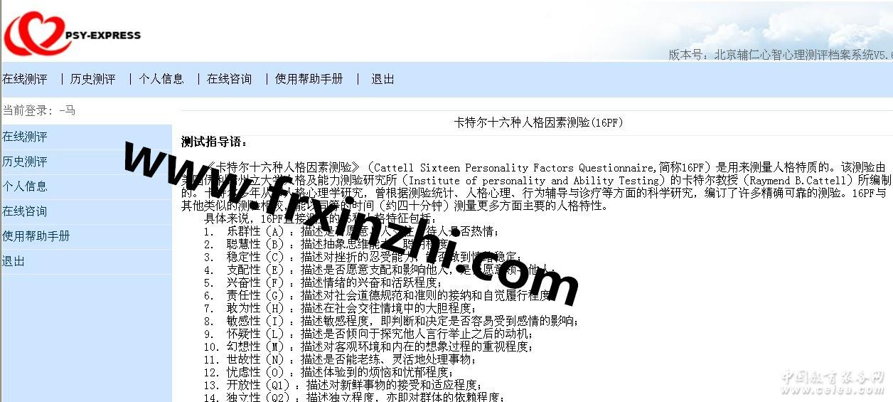 產品詳細介紹輔仁心智心理測評系統(綜合版),心理測試軟件,心理測評軟件 個性測試1.卡特爾十六種人格測驗(16PF) 適用于15歲以上青少年及成年人測查的全面的人格分析,可用于就業咨詢或人才選拔。 2.艾森克人格測驗(EPQ) 艾森克人格測驗適用于測試時間要求較短條件下人格分析。 3. 愛德華個人偏好測驗 愛德華個人偏好測驗適用于個人需求方面的人格分析,225題。 4. 明尼蘇達多相人格測驗(MMPI) 明尼蘇達多相人格測驗適用于進行較全面的人格分析。 5. 超常行為檢查測驗 超常行為檢查測驗適用于檢查是否具有超常行為特征,共97題。 6. 中國青年人格測驗(CPI) 中國青年人格測驗適用于人才選拔方面的人格分析。 7. 兒童自我意識測驗 本量表可適用于8-16歲兒童。 8. 十四種人格測驗(14PF) 適用于8-14歲的中小學生的人格分析。 9. 氣質測驗 氣質測驗,60題。目前國內應用較廣的一種氣質測驗工具。 10.人生觀測驗 適用于已形成了對人性相對固定看法的18歲以上的成年人。 11.自信心測驗 自信心測驗共13道題,適用于18歲以上成年人。 12.自卑感測驗 適用于中學生、大學生及成年人使用。 13.樂觀性測驗 這個測驗還將告訴你如何看待生活,如何做一個積極樂觀的人! 14.固執性測驗 通過固執性測驗來看看你屬于哪一種人。 15.個性成熟度測驗 個性成熟度測驗來測試一個人生經驗豐富的程度。 心理健康測試16.心理健康臨床癥狀自評(SCL-90) 心理健康臨床癥狀自評適用于測查被試的心理健康狀況。 17.抑郁自評量表 適用于測查被試最近一段時間的的抑郁程度. 18.焦慮自評量表 適用于測查被試最近一段時間的焦慮程度. 19.中小學生心理健康測驗(MHT) 綜合檢測中小學生的心理健康狀況。 20.大學生人格健康調查測驗(UPI) 適用于篩查大學生的心理健康狀況的篩查 21.Beck抑郁測驗 適用于分析成年人各年齡段的抑郁感強度。 22.生活事件測驗 包括家庭生活、工作學習方面、社交及其他,三方面的問題。 23.青少年生活事件測驗 適用于小學高年級、初中和高中學生面臨挫折事件的承受程度。 24.大學生行為問題測驗 能夠較為準確而迅速的反映出該學生目前是否存在嚴重的行為問題。 25.Achenbach兒童行為測驗 適用于測查4-16歲兒童的不同行為問題。 26.中小學生適應能力測驗 學生的學習、生活環境的協調程度。 27.壓力應對方式測驗 用于初中以上形成相對穩定應對方式的被試使用。 28.兒童多動癥核查測驗 兒童多動癥核查適合診斷年齡低于17歲的兒童是否具有多動行為傾向。 29.網絡成癮測驗 中學生網絡成癮量表可用于測查中學生使用網絡的情況。 30.兒童孤獨測驗 用于評定挑選出不合群的兒童,并了解最不被同學接受的兒童是不是最孤獨。 31.自殺態度測驗 適用于分析16歲以上的人群對自殺的態度。 32.社會適應性自評測驗 本問卷將幫助被測試者了解自己的心理成熟程度。