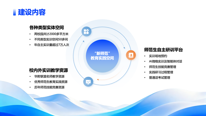 在三個校園三千多平方米的物理空間內(nèi),有序分布著80余間功能各異的實訓(xùn)室,構(gòu)成了一個立體化、矩陣式的實訓(xùn)環(huán)境。與之配套的師范生自主研訓(xùn)平臺,實現(xiàn)了從實訓(xùn)場地預(yù)約、AI微格實訓(xùn)、技能競賽管理、實踐研習(xí)過程跟蹤、到普通話考試管理的全流程數(shù)字化覆蓋,貫通師范生實訓(xùn)全場景,為學(xué)校落實“職前職后一體化、培養(yǎng)測評一體化、線上線下一體化”的“三個一體化”理念提供了技術(shù)支撐。截至目前,新空間年自主實訓(xùn)量已突破7萬人次,真正成為支撐師范生日常學(xué)習(xí)與專業(yè)成長的重要平臺。