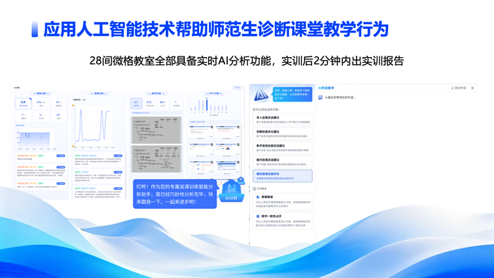 課后,借助生成式人工智能與視音頻技術(shù),系統(tǒng)全程自動記錄并分析試講過程,即時生成AI診斷報告,對導(dǎo)入技能、講授邏輯、互動有效性等維度進(jìn)行量化與綜合評價,實現(xiàn)“一對一”精準(zhǔn)反饋。這一閉環(huán)訓(xùn)練幫助學(xué)生提前掌握數(shù)字化教學(xué)全流程,極大縮短了從大學(xué)課堂到真實教學(xué)的適應(yīng)期。