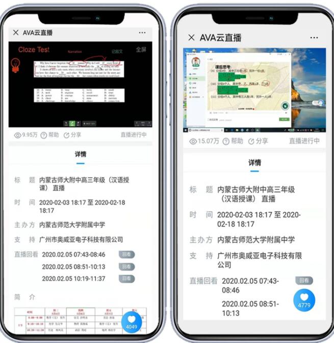 2月6日,阿拉善盟第一中學在奧威亞錄播教室和移動錄播設備支撐下,順利組織高三學子開展“空中課堂”,這也是內蒙古自治區第一個實施疫情期間“停課不停教、不停學”的學校。通過奧威亞云直播技術,學生只需在家通過手機、平板、電腦等便攜方式即可進行聽課,真正實現在“師生不聚集”前提下,開展教學活動。