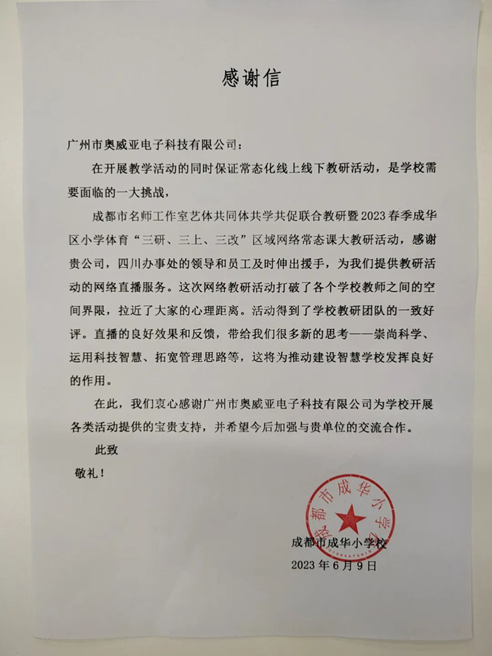 在四川,奧威亞的服務足跡已經(jīng)遍布17個市州,橫跨東西1300公里。隨著項目的不斷落地,我們也收到了多所學校的高度肯定!