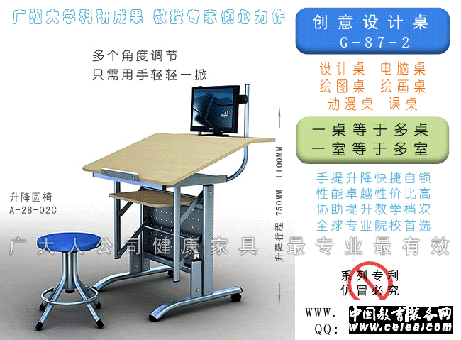 創意設計桌 多功能升降,一桌等于多桌: 普通書桌、繪畫,設計桌,一間課室等于多間課室。 ·作普通書桌:可微調高度角度,預防近視、腰椎病和頸椎病。 ·特殊書桌:可站立學習和工作,回復人體脊椎和呼吸的自然狀態,預防肥胖和痔瘡。 ·作繪畫桌、設計桌:可調任意角度,可調節多個高度,可疊加大圖板;無需電源,價格低廉。 CREATIVITY TABLE Multifunctional movement,One desk has more functions: common desk, rawing table,designingtable. One classroom had three functions. ·As general desk :The height and the angle can be adjust,prevent from short sight , lumbar and neck hurt . ·As special desk :Can study and work at stand pose, and make your chine release, prevent illness . ·As design table :The angle and the height can be adjust ,and attach a big size board. No power needed ,low price.