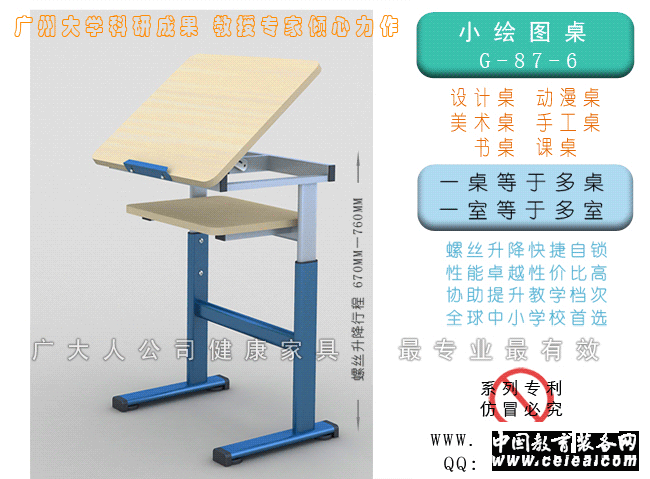 DRAFTING TABLE Multifunctional movement,One desk has more functions: common desk, rawing table,designingtable. One classroom had three functions. ·As general desk :The height and the angle can be adjust,prevent from short sight , lumbar and neck hurt . ·As design table :The angle and the height can be adjust ,and attach a big size board. No power needed ,low price.