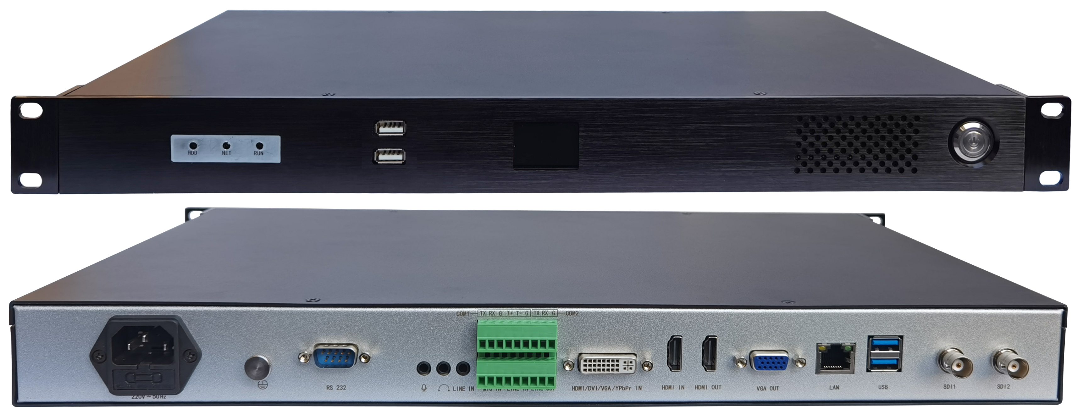 二、 主要特性 1. 集支持4K合成編碼、4KHDMI輸入、4K合成HDMI輸出、RTSP/H.323/SIP多協(xié)議四方互動(dòng)、音頻處理為一體。 2. 主機(jī)內(nèi)置錄制、直播、點(diǎn)播、導(dǎo)播管理、存儲(chǔ)、無(wú)縫切換等功能集成在一臺(tái)主機(jī)內(nèi)。 3. 主機(jī)1U架構(gòu),前面板內(nèi)嵌液晶監(jiān)視器,采用嵌入式DSP純硬件架構(gòu);Linux操作系統(tǒng);能夠7*24小時(shí)工作; 4. 視頻輸入接口:4路物理接口。分別為高清攝像機(jī)3G/HD-SDI輸入2路、1路HDMI輸入接口、1路DVI-I(HDMI/VGA/DVI),4路網(wǎng)絡(luò)源。方便接入網(wǎng)絡(luò)攝像機(jī)或者與第三方系統(tǒng)對(duì)接; 5. 視頻輸出接口:2路高清輸出端子可輸出2路不同畫(huà)面,端子分別為1路HDMI輸出,最高支持4K輸出; 1路VGA 1080P輸出; 6. 音頻接口:1路麥克風(fēng)接入自帶幻象電源;1路立體聲線路接入;1路線路輸出、1路3.5mm本地耳機(jī)監(jiān)聽(tīng)接口,1路3.5mm麥克風(fēng)輸入,1路3.5mm立體聲輸入。 7. 控制接口:4路RS232/RS485串口、4路USB接口,其中1路支持USB3.0。 8. 網(wǎng)絡(luò)接口:1路RJ45 LAN接口。 9. 編碼:1路4K編碼;或7路1080p30fps音視頻編碼;獨(dú)立4路音頻采集。 10. 解碼:4路1080p30fps音視頻解碼; 11. 編碼格式:視頻支持H.264SVC/HP/MP/BP可選;音頻音頻編碼格式AAC/G.711。媒體文件格式MP4。視頻編碼碼流:56Kbps~16Mbps可調(diào),音頻采樣率8-48HZ可調(diào),音頻編碼碼率8-320Kbps可調(diào)。 12. 畫(huà)面合成:1路畫(huà)面合成,提供2/4/6/8/自定義等多種模式選擇,合成分辨率4K或1080P設(shè)置。 13. 可選配音頻處理器模塊:支持混音編組、自動(dòng)反饋抑制AFC、自動(dòng)回聲消除AEC、自動(dòng)噪聲消除ANC; 14. 遠(yuǎn)程互動(dòng):支持RTSP/H.323/SIP等多協(xié)議混合遠(yuǎn)程應(yīng)用模式,RTSP/SIP支持四方互動(dòng)模式; 15. 流媒體協(xié)議:支持TCP/UDP/RTSP/RTP/RTMP/ONVIF/H.323/SIP/TS協(xié)議 16. 存儲(chǔ):標(biāo)配1T硬盤,最大可支持1路SATA接口硬盤,支持單盤6T硬盤,可實(shí)現(xiàn)7路碼流實(shí)時(shí)存儲(chǔ)能力,在設(shè)備網(wǎng)頁(yè)及設(shè)備輸出導(dǎo)播界面中具備對(duì)單個(gè)視頻文件查看、下載、與刪除等功能。 |