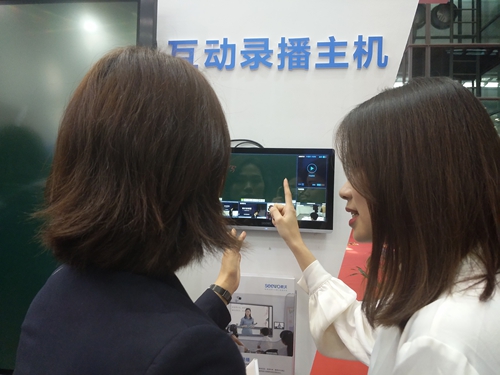 在希沃互動(dòng)錄播前,一位女士與希沃工作人員興致勃勃地交談著,原來是想詳細(xì)了解希沃互動(dòng)錄播是如何打造易應(yīng)用、易普及的常態(tài)化錄播課室。希沃工作人員熱情回答:希沃互動(dòng)錄播,為教學(xué)提供了簡潔易用的本地錄播、跨地互動(dòng)、資源共享、教研評價(jià)等功能,幫助學(xué)校實(shí)現(xiàn)優(yōu)質(zhì)教學(xué)資源的開發(fā)和普及,讓師生的跨時(shí)空資源共享更簡單,教師不再需要?jiǎng)趲焺?dòng)眾就可以自行錄播,實(shí)現(xiàn)常態(tài)化使用。