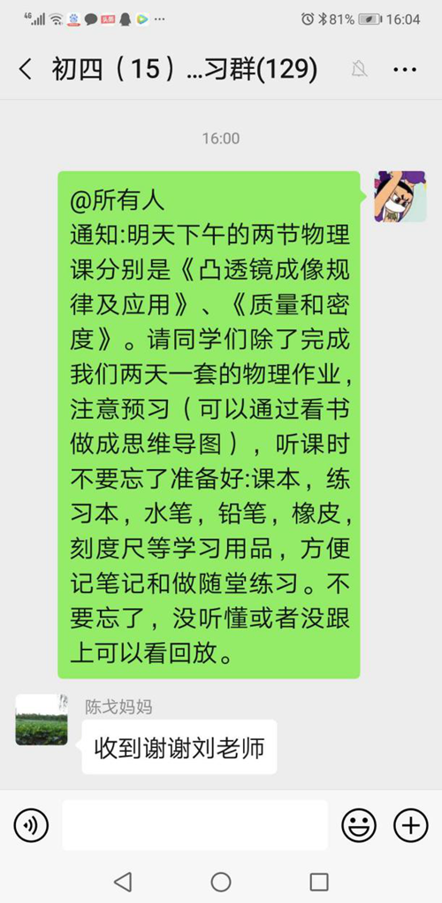 每次物理直播的前一天,我都會在家長微信群里發出這樣的公告,提醒孩子對要復習的章節預習,準備好上課的用具,還有激勵他們的語言。