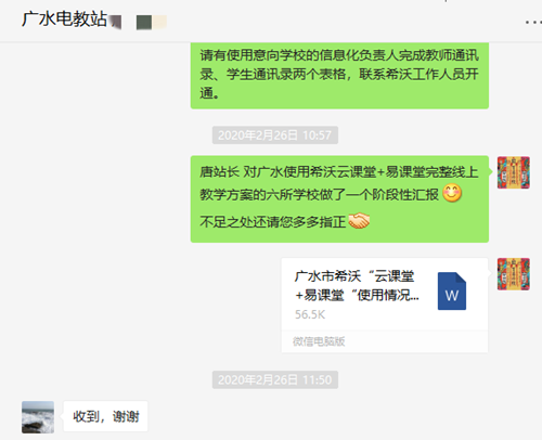 根據(jù)工作部署,廣水市中小學(xué)網(wǎng)絡(luò)教學(xué)工作確定于2月10日全面拉開序幕。接到任務(wù)后,希沃團隊立即展開行動。為確保廣水市老師們的正常使用,希沃團隊自2月3日起組織了多次線上培訓(xùn),同時建立微信答疑群,無論多晚都能提供及時有效的答疑。2月5日,希沃線上直播課和易課堂作業(yè)平臺正式開始使用,在雙方緊密合作之下,老師們很快地掌握了希沃易課堂的操作。