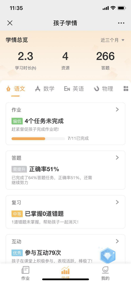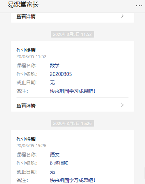 廣水市長嶺鎮(zhèn)中心小學(xué)學(xué)生家長:“關(guān)注易課堂家長公眾號就可以收到老師布置的作業(yè)提醒,非常的方便。孩子做完后還能查看具體的學(xué)習(xí)情況,對做的不好的地方可以重點輔導(dǎo),省去了很多和老師溝通的時間。”