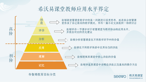 為了讓老師們在名師聯(lián)盟里,有更加明確的成長提升的目標(biāo)和方向,結(jié)合經(jīng)典的布魯姆認(rèn)知認(rèn)知目標(biāo)分類模型,為名師聯(lián)盟的老師們量身定制了一套,專屬于名師聯(lián)盟的能力提升模型,幫助老師們基于希沃易課堂產(chǎn)品的基礎(chǔ)使用,到結(jié)合智慧課堂理論進(jìn)行科學(xué)、合理、有知識體系地開展教研活動(dòng)。