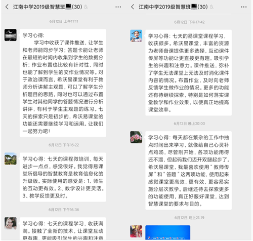 ②成立智慧課堂社群,分享學習感悟:智慧課堂班級的老師們每天在群里分享自己使用希沃易課堂的感悟,以及分享功能應用的小技巧,形成以師帶師的良性循環。