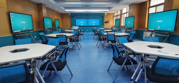 為協助山東商業職業技術學院打造小組研討型智慧教室,希沃為其在智慧教室配置了雙拼電容一體機。雙屏一體,超窄的邊框,在課堂中能帶來雙倍大視野。同時,雙拼電容一體機的復制屏、拓展屏、外接屏等多種模式,能讓老師在授課過程中根據需要隨心切換。