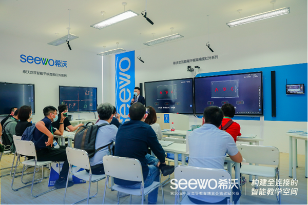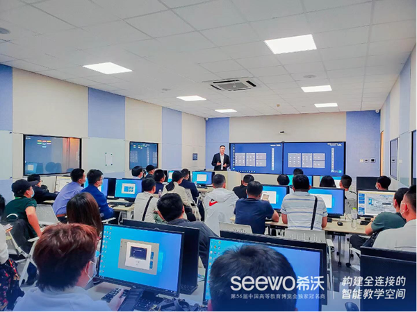除了展會現場的精彩活動,希沃還力邀各位參展嘉賓前往青島大學參觀智慧教室樣板間。其中小組研討教室,利用希沃品課系統配合交互智能顯示設備,實現教師端、小組端及學生端三端互聯,組成互動教學系統;搭配四機位交互智能錄播滿足日常金課課程庫建設,輔以物聯中控講臺、校園宣傳、及教室擴音系統,實現高校教室環境下教學全過程的智能交互,互動應用。
