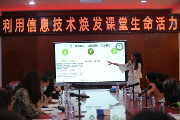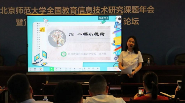 隨后,宜賓市第六中學涂萬敏老師帶來了智慧課堂《一顆小桃樹》。她通過運用希沃易課堂的相關(guān)功能,把課前預習、課堂活動、反思提升等環(huán)節(jié)有機整合起來,并設(shè)計互動游戲環(huán)節(jié)來進行教學,實現(xiàn)了良好的師生互動和生生互動,激發(fā)了學生學習的興趣和積極性,有效地提升了課堂效率,贏得了大家的一致好評。