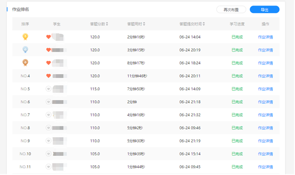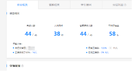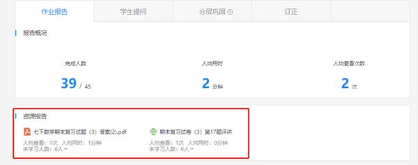 老師通過教師空間挑選資源,將習題推送給學生進行練習,學生在平板上答完題后,老師可在作業報告上查看學生們的作答情況。通過線上能夠及時看到學生的完成情況、答題正確率,讓線上教學也能夠精準把握到學生的復習進度。