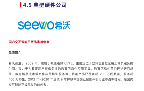 報(bào)告分析,希沃強(qiáng)大的硬件研發(fā)和生產(chǎn)能力,并緊抓教育信息化對(duì)硬件產(chǎn)品的剛需,是其作為硬件廠商典型代表的優(yōu)勢(shì)。