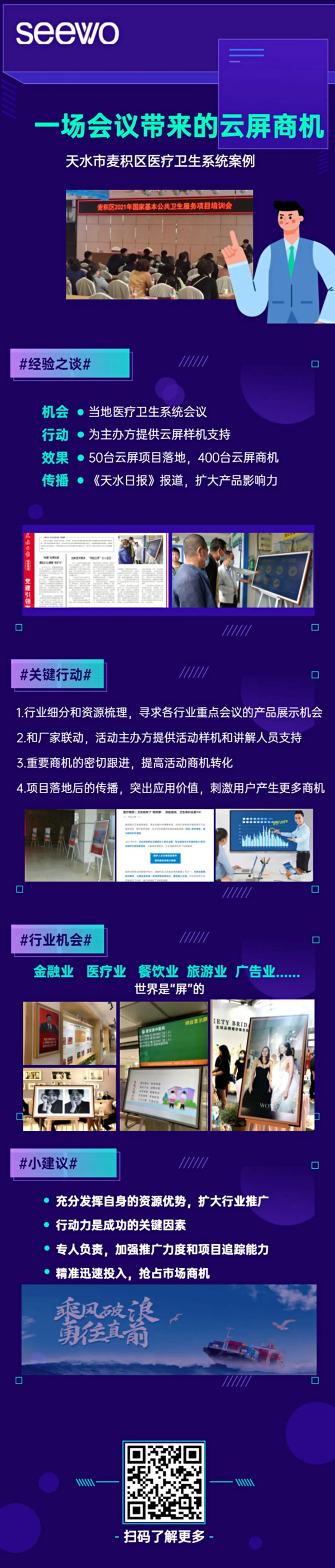 隨后,希沃屏顯事業(yè)部王濤,為各位合作伙伴分享了入校推廣的優(yōu)秀案例“一場(chǎng)會(huì)議帶來的云屏商機(jī)”。
