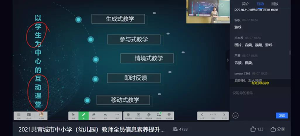 8月7日-8月8日為培訓(xùn)的第一階段,在此培訓(xùn)階段中,希沃金牌講師葉玉梅為參與培訓(xùn)的老師們開展了為期兩天的線上直播授課環(huán)節(jié)和線上研修班開班儀式。其中,直播課內(nèi)容圍繞《多媒體技術(shù)在信息化教學(xué)中的應(yīng)用》《希沃白板-課件制作》《班級(jí)優(yōu)化大師-班級(jí)管理》《微課錄制》等四個(gè)不同的課題展開。