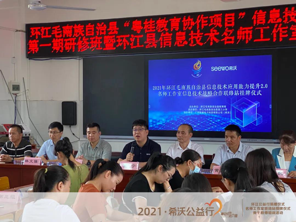 2021年8月19日,希沃在環江毛南族自治縣第三小學舉行了希沃公益行設備捐贈儀式。同時,希沃攜手環江毛南族自治縣教育局,共同助力環江縣名師工作室骨干教師成員開展了為期兩天的“粵桂教育協作項目”研修班活動,讓骨干教師團隊就創造更多樣化教學模式展開了深度的研修和探討。環江毛南族自治縣教育局莫李全委員、電教站黃廣正站長、譚炤宇副站長、師培中心覃品優老師、林文強老師、環江三小校長羅懿校長、希沃廣西區域總經理郭寧等領導受邀出席了本次活動,并與教師們共同見證了環江毛南族自治縣信息技術名師工作室希沃聯絡站授牌儀式。