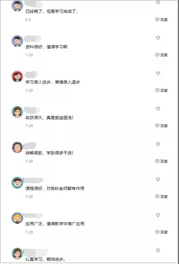 參訓教師在學習后積極留下心得和反饋,不同學校、不同學科的教師在留言平臺相互交流學習,隨后,大家對教育信息化的發展展開了研討。