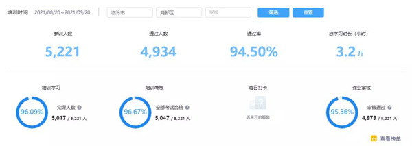 其中,對于培訓的過程化管理,希沃使用了區域教師發展管理平臺來幫助區域管理者即時了解當地區域教師發展水平,這也為培訓推進決策的科學化提供數據支持。自培訓開展以來,堯都區累計參訓學校68所,參訓教師人數5221人,培訓結業人數4934人,綜合結業率高達94.50%,累計學習時長超過3.2萬小時。經過本次線上培訓,區域內教師信息素養得到了普遍提升。