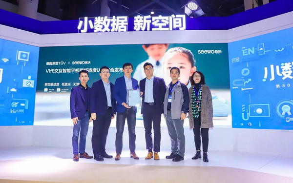 在嘉賓和觀眾們熱烈的掌聲中,希沃新一代交互智能平板獲得德國萊茵TüV頒發的認證證書。