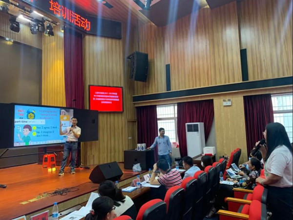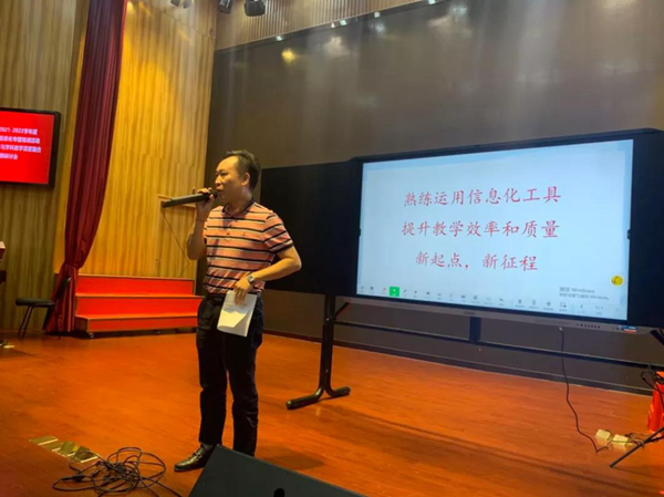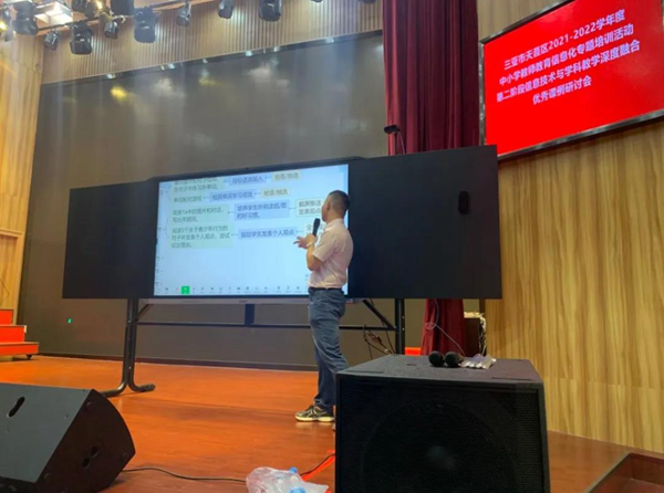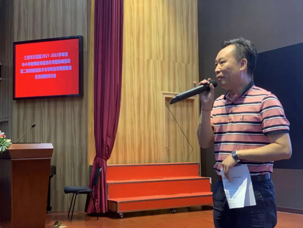 天涯區教育局教研室主任楊得伸上臺發表講話:“當前,教育信息化已經步入加快推進的黃金時期,也進入升級發展的關鍵期。我區堅持‘以信息技術與教育教學深度融合推動教育理念變革、模式再造、體系重構、機制創新’核心理念,聚焦‘智慧教育示范區’建設目標,聚力實施‘天涯區智慧教育建設行動’。在剛結束的線上學習中,我區共計886人通過培訓,整體培訓通過率達到87%,其中16人被評為優秀學員;在此我對以上老師表示衷心的祝賀。今天我們邀請到?诒睅煷、華二黃流中學、北京外國語附屬的三名教師給我做公開課分享交流活動。希望老師們有所成長、有所收獲。最后,要再次感謝希沃在本次活動中的大力支持!